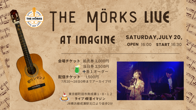 The Mörks Live~2024.7.20~ SCHEDULE 2024/07/20(土) 16:30 - 18:00 OPEN/16:00, START/16:30 1年ぶりライブ喫茶イマジンでのライブです♪ 前売券・配信チケットのご購入はこちらから🔽 https://themorks.bitfan.id/events/7353 URLをコピーする 報告する
